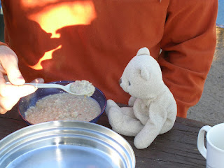 Uncle Kerms was already up cuz he had to make the coffee and the oatmeal. Grownups need to drink coffee even when they're doin' some campin'. I just ate oatmeal and drank milk. Here's a picture of me eatin' some oatmeal.