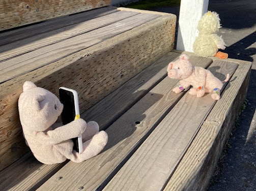 When we weren't lookin', Darsie took one of the wolf-howling-at-the-moon pendants and climbed up on the steps with it.